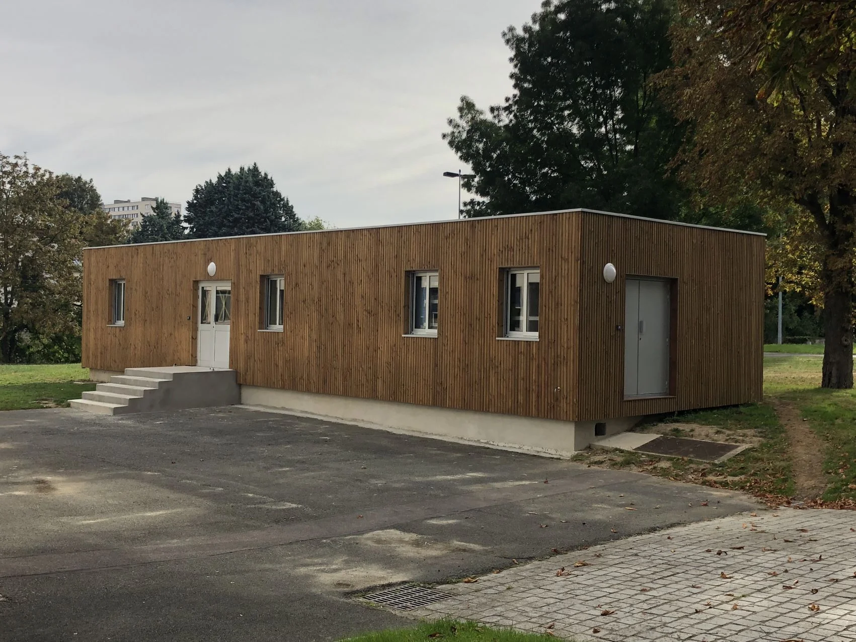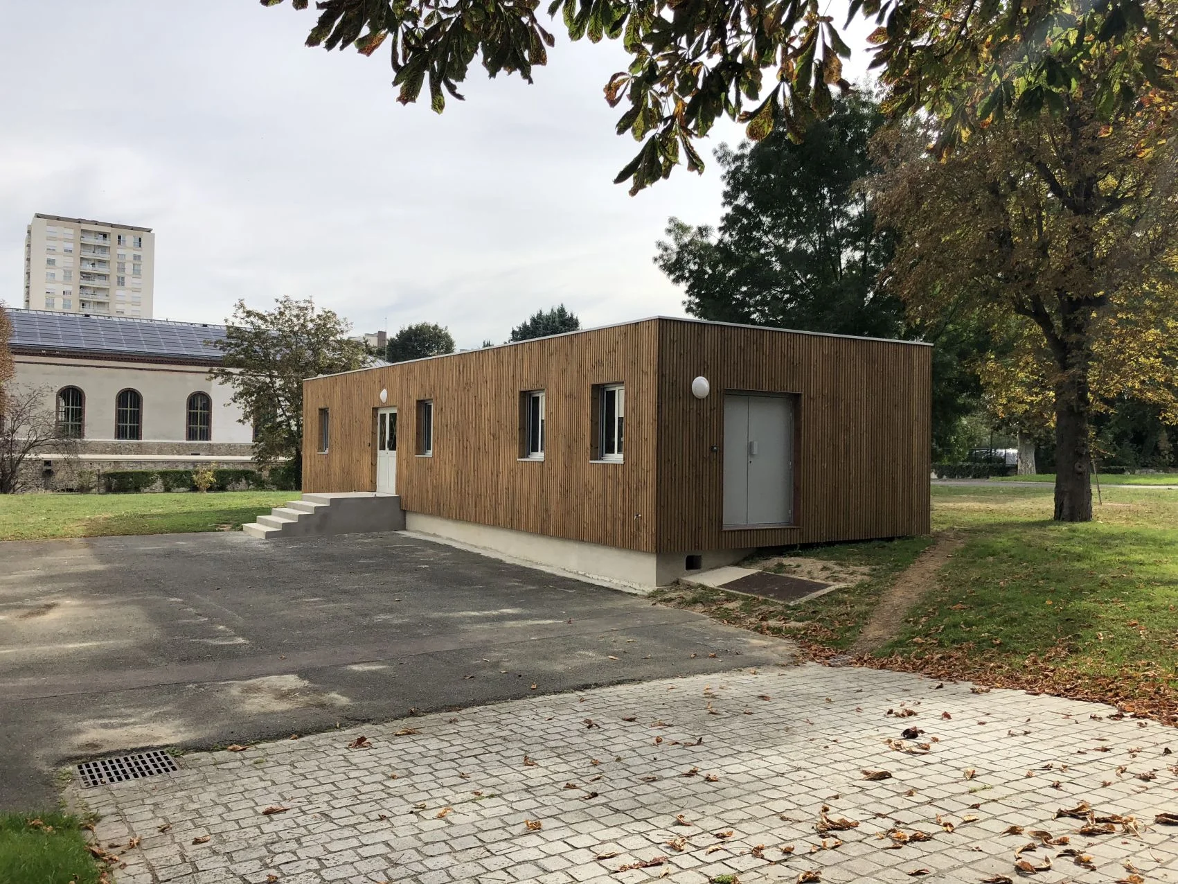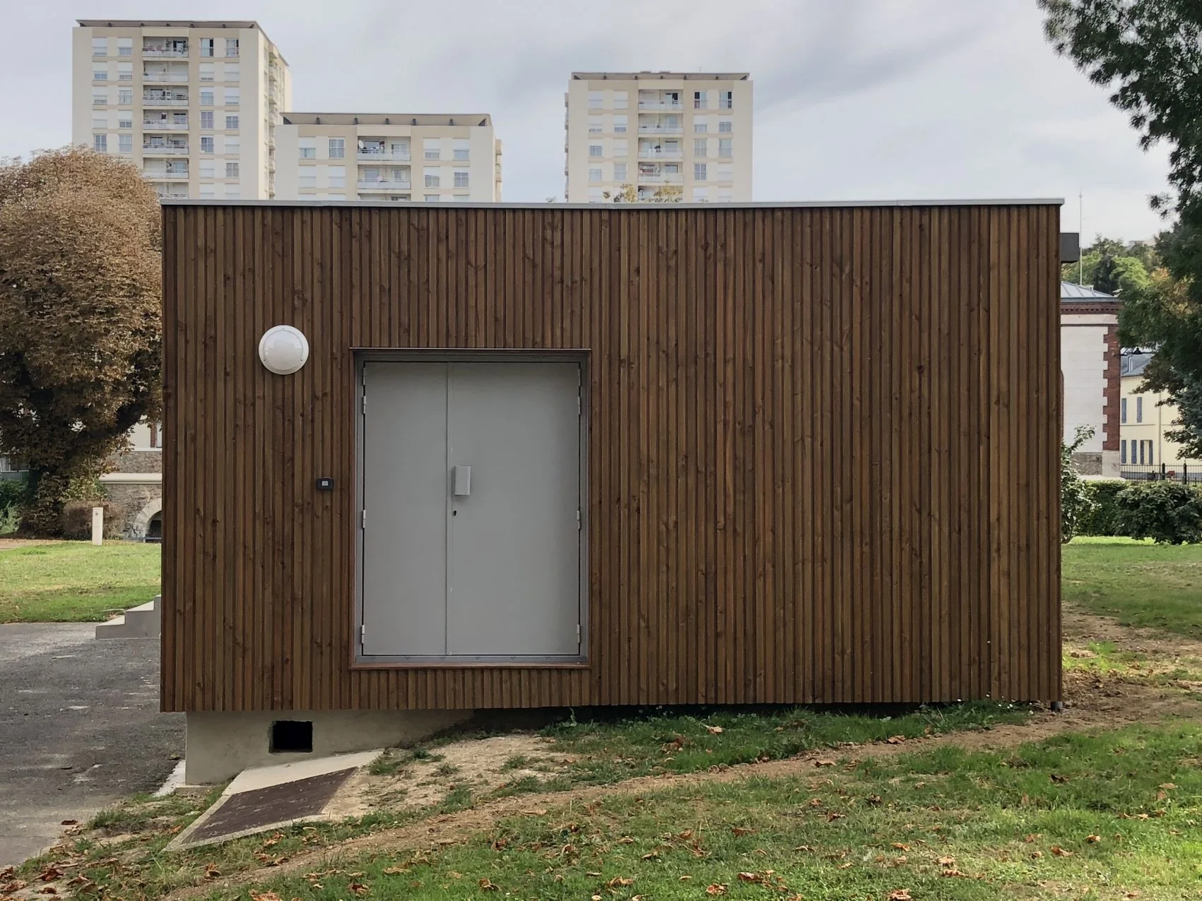 Isolation extérieure des locaux de la société des Eaux de Paris (marché public) situés sur le site de Joinville-le-Pont : isolation extérieure avec ravalement du bardage vertical (essence de bois "douglas", traitement autoclave teinte marron), nouveau plancher pour toiture-terrasse, étanchéité de toiture-terrasse de type EPDM.